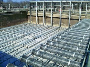 Second, the existing aeration tanks were converted to Integrated Fixed-Film Activated Sludge (IFAS) tanks in order to more efficiently use the tanks. The first stage is an anoxic stage where nitrates are recycled and converted to nitrogen gas (denitrification). The second stage is an IFAS tank packed with plastic media providing a surface for nitrifying bacteria to grow. The increased population of microorganisms is able to treat the increased load of nutrients. The third and final stage is a re-aeration stage for carbonaceous BOD removal and further nitrification.