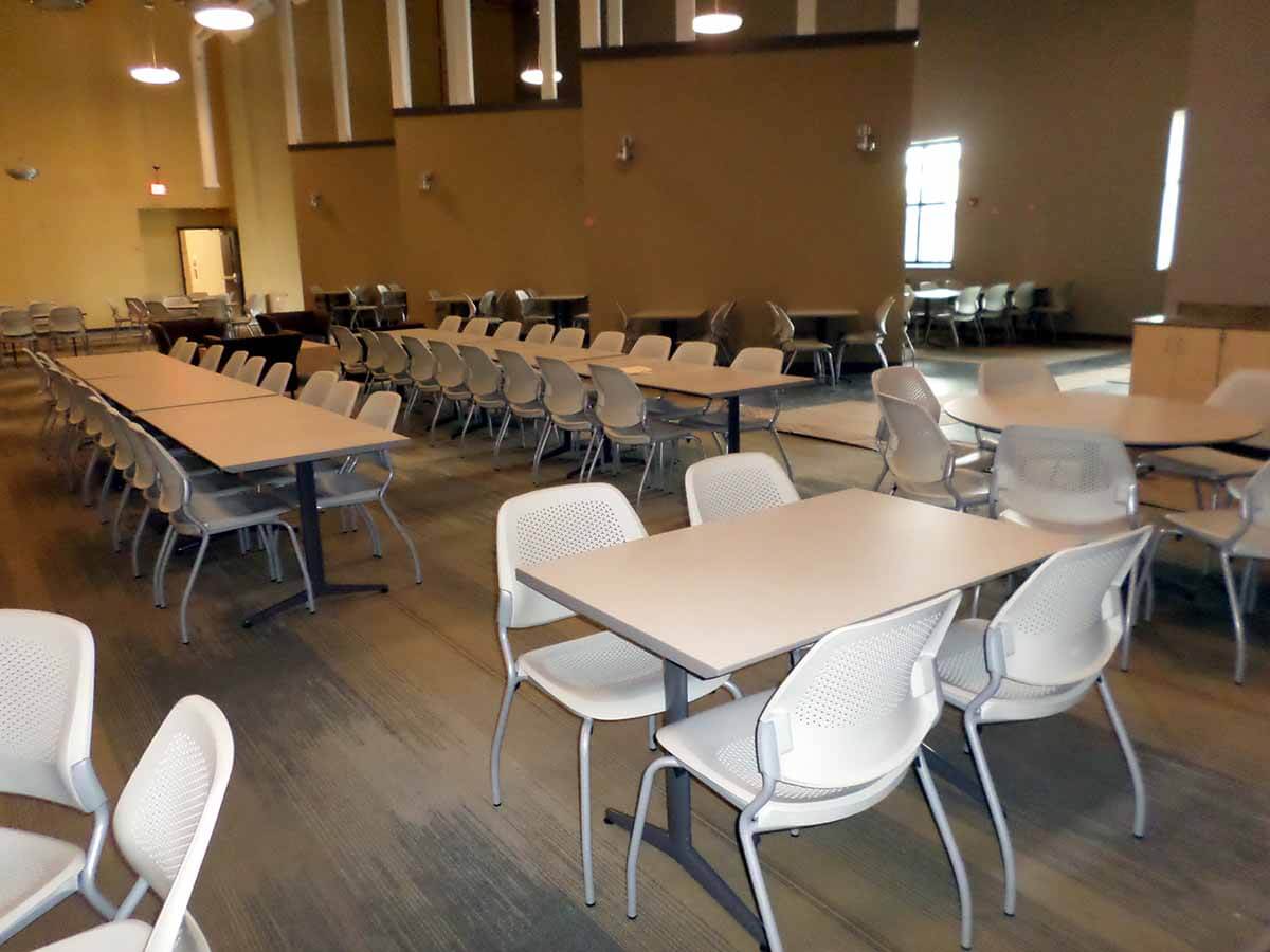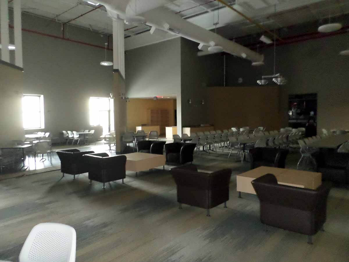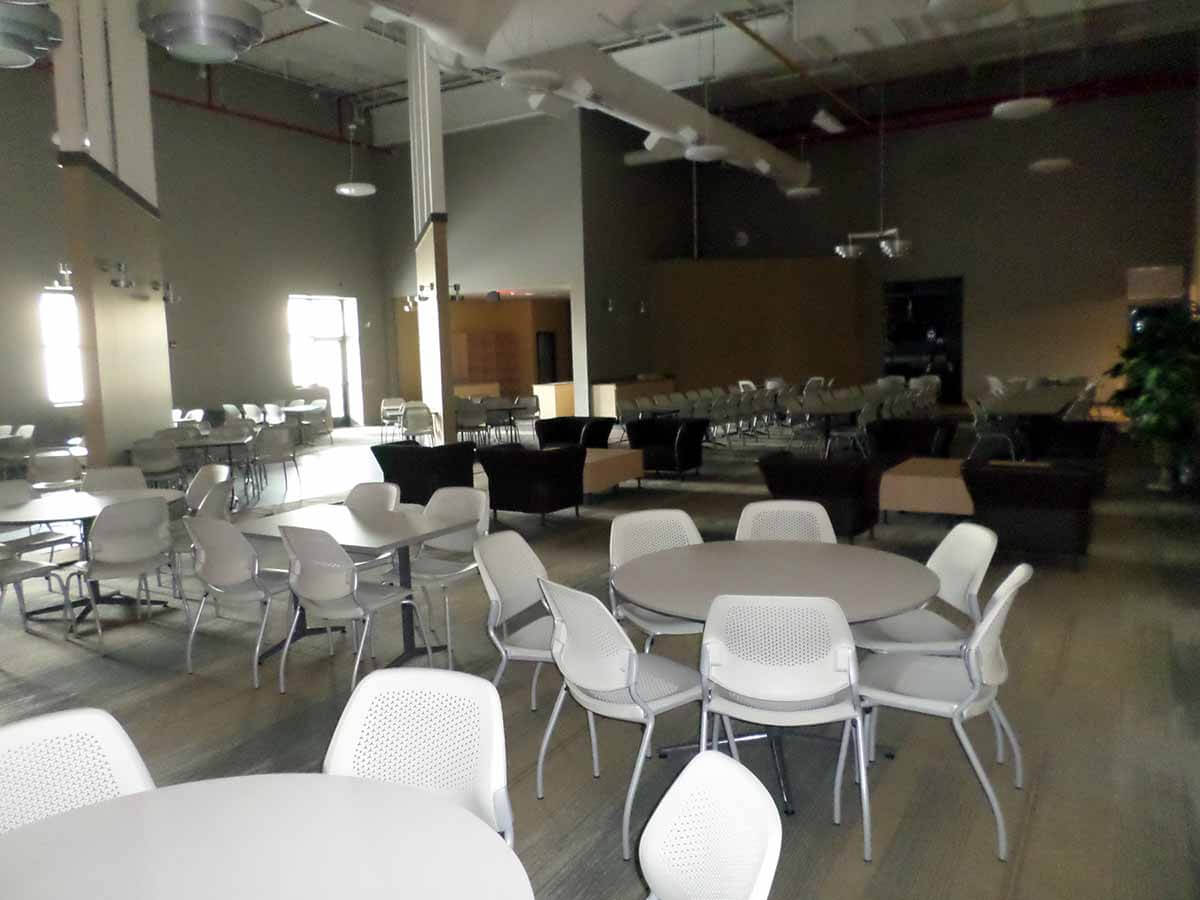 Bay 3 was partially renovated to include industrial training classrooms and a food service area with dining room, food court, and food preparation kitchen, including dry storage and cooler units. The dining space and court services all of Bays 1, 2, and 3 and is also open to the rest of the Depot to allow for renovations to dining rooms and kitchens elsewhere on the installation. Exterior improvements included a new building entrance, skylights, and windows. A new main entrance was constructed at the front of the building to provide ADA access to the building and included an entrance canopy above the doors to the vestibule along with new stairs and ramp. A series of skylights have been installed over the main aisle in the open office areas to allow daylighting to penetrate within the building. New windows were added to the north and east sides of the building to provide views to the outdoors. The exterior improvements were designed in accordance with the Anti-Terrorism Force Protection requirements. The improvements also had to meet the installation’s design standards. The Buchart Horn team was responsible for the design of all required demolition and new work related to the site work, architecture FFE design; structural; heating, ventilation, and air conditioning; plumbing;, and fire protection systems (sprinkler and fire alarm); HazMat abatement; electrical power, communications, data; and special systems. The project was designed in three phases but was constructed in a single phase.