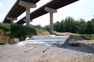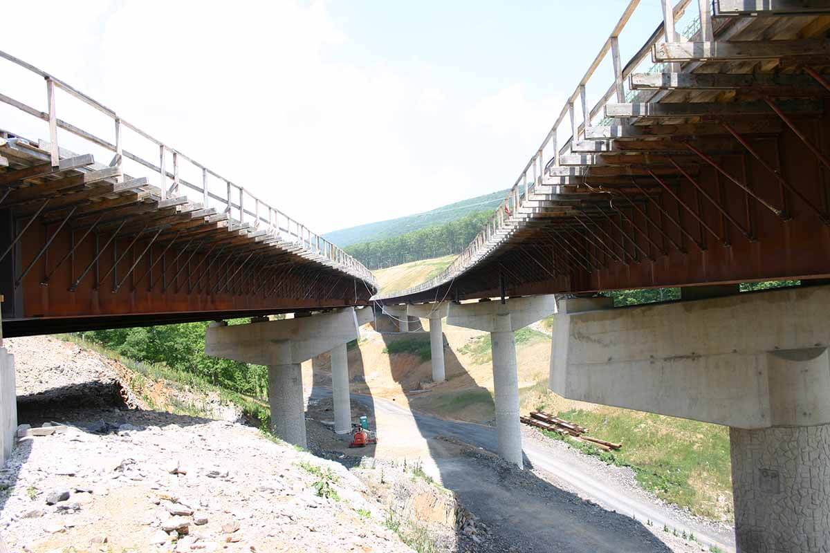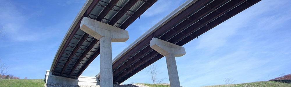 Subsequent to these studies, Buchart Horn performed design for the Bismarck to Forman section, a 2.39-mile section of four-lane, limited-access highway. Notable elements of this section included two major dual structure bridges. One set of bridges consists of five spans crossing Grant County Route 1. The westbound bridge is 1,040 feet long and the eastbound bridge is 1,060 feet long. The second set of bridges carries the highway over Grant County Routes 1 and 42/3, North Fork Patterson Creek, and an active stone quarry. The westbound 1,113-foot bridge and the eastbound 1,107-foot bridge each consist of six spans.