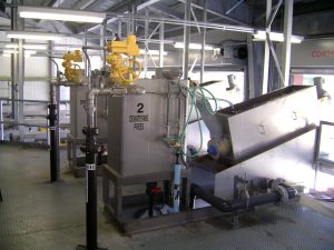 Sediment collected from the basin is pumped to a new residuals handling facility that houses three 16 feet by 24 feet batch thickeners and an advanced dewatering system called volute dehydrators. The sediment is thickened from about 1% solids to about 4% solids before being fed to the volute dehydrators. A volute dehydrator was pilot tested at the York Water facility and was shown to produce a material of approximately 25% solids. The dewatered material is loaded by conveyor into roll-off containers, and is classified as a co-product and used off-site as a soil supplement.
