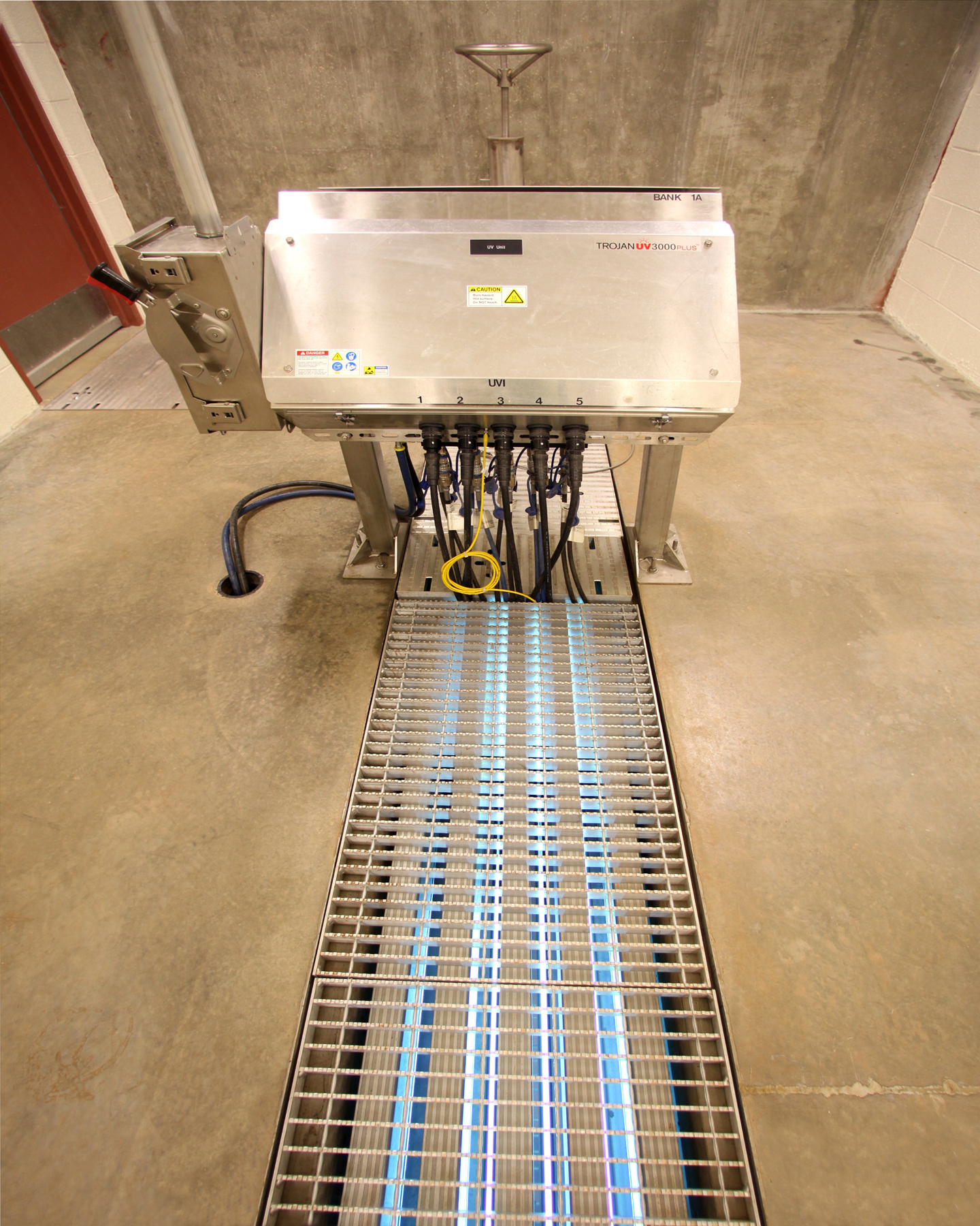 The new WWTP consists of two SBR tanks discharging directly to a new 3.6 MGD UV disinfection system. The UV disinfection system is housed in the SBR control building and consists of one UV channel having two banks of low pressure, high intensity self-cleaning UV bulbs. Fiberglass troughs are used to control the water level over the UV bulbs. Effluent from the UV system is discharged to a post-aeration cascade.