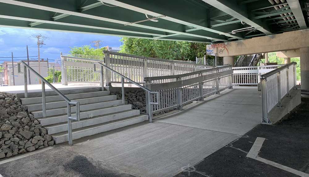 A new ADA compliant switchback ramp beneath the Birmingham Bridge connects two parking lots at different elevations. This prominently signed and well-lit ramp enhances safety by allowing bicyclists, pedestrians, and wheelchair users to circumvent a major intersection.