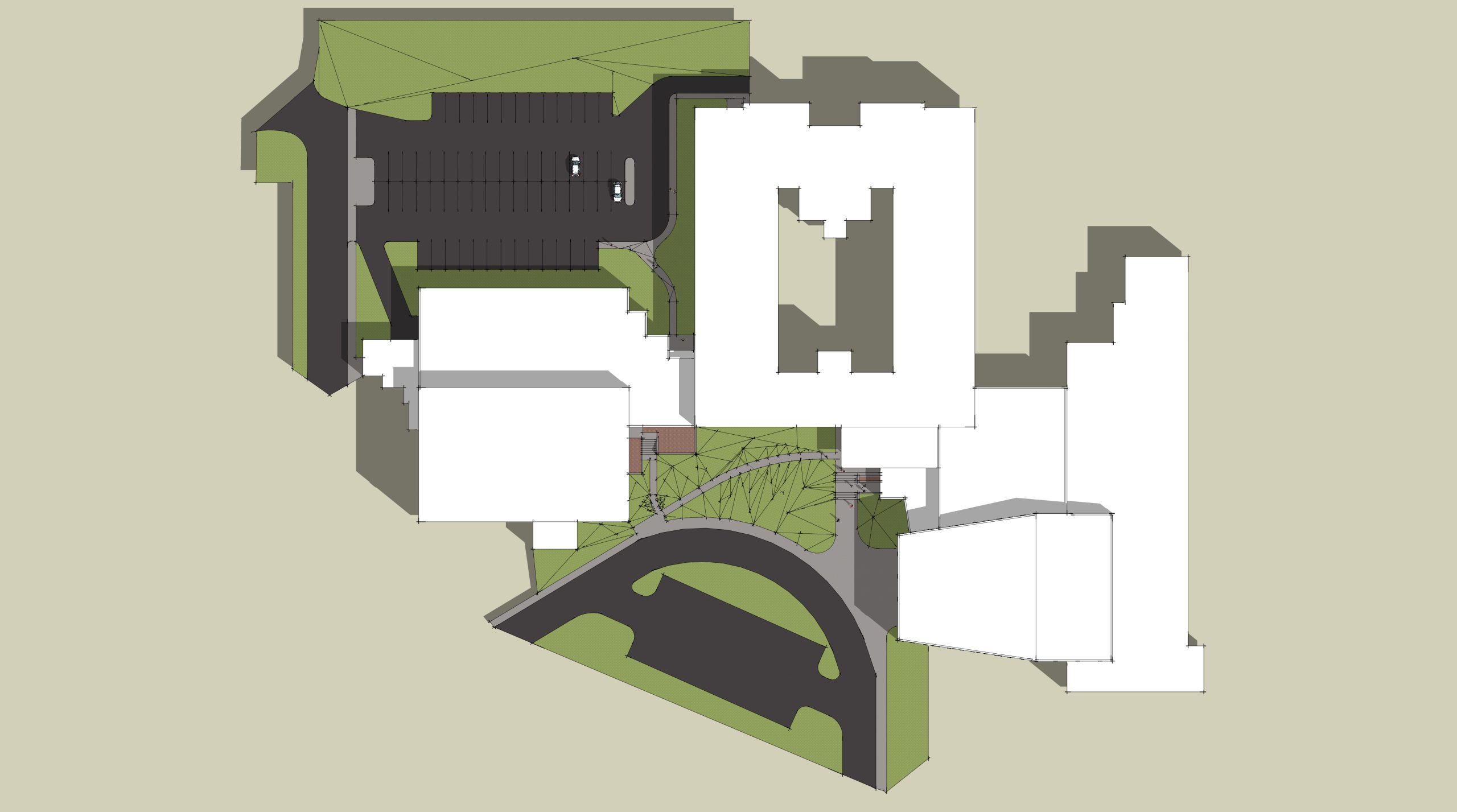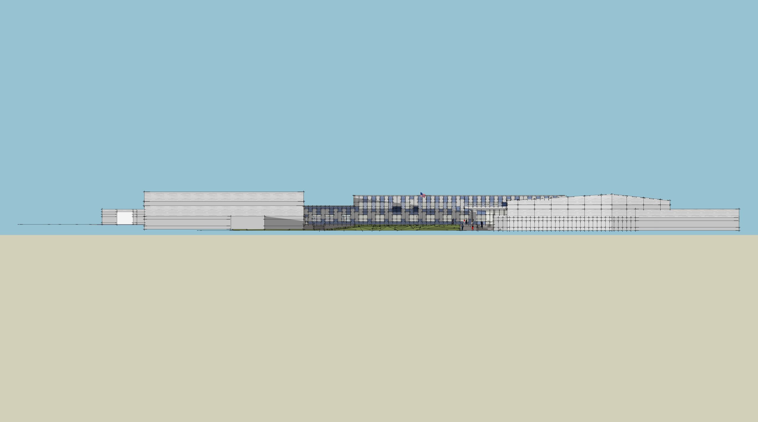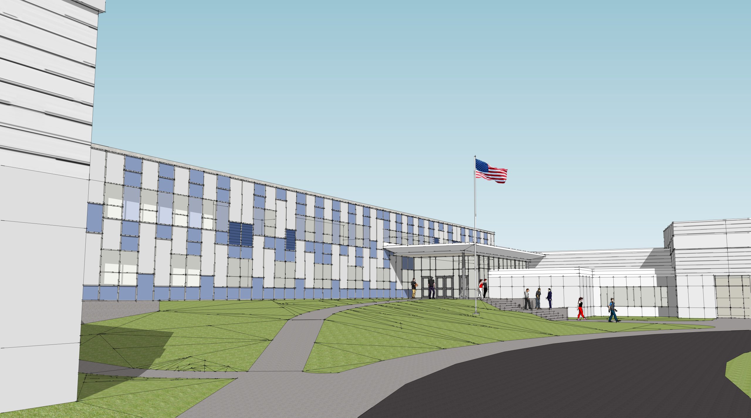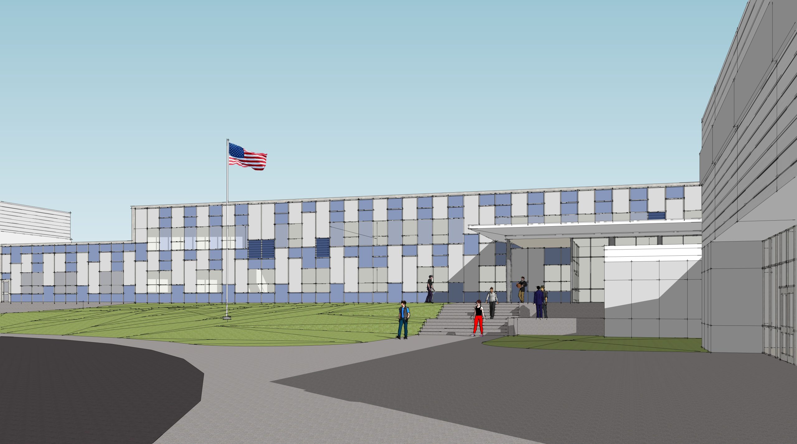 The existing bus canopy along the north side of the building was removed and an improved access door and cover canopy accommodate the traffic of students commuting between the high school and the career center. Bus drop-off occurs in the front, or west side, of the building. A new main entrance allows reception office personnel to watch buses, students, and visitors arriving and exiting. A new access ramp was designed in the existing plaza area to allow those with disabilities to approach the main entrance.