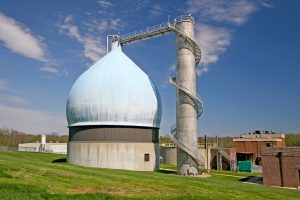 The treatment of the wastewater results in the production of waste solids or sludges. The primary, waste activated, and industrial sludges (piped directly from an industrial pretreatment plant) are processed in a 1.2-million-gallon, egg-shaped anaerobic digester. The anaerobic digestion process involves heating to 100°F and mixing the digester contents for approximately 30 days. The digestion process reduces the amount of solids by more than 50% and transforms the sludge into biosolids.