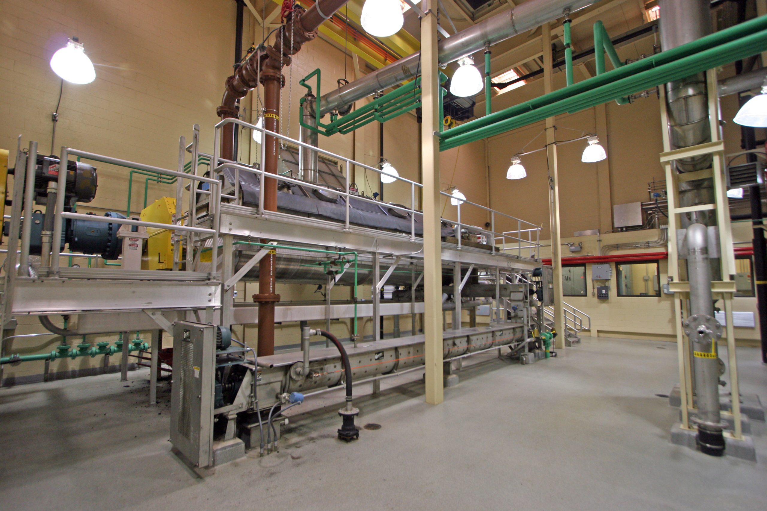 The liquid, digested biosolids are physically dewatered into a cake-like form using a high speed solids separator known as a centrifuge. This cake is then fed to an indirect, steam-heated paddle dryer that heats the biosolids cake to more than 300°F in a pasteurization-like process. The resulting product is a dry granular, high quality fertilizer product known as STEADIGRO™.