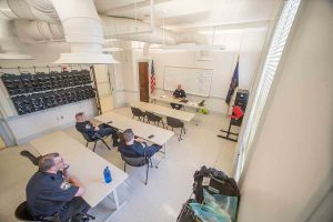 BH developed a detailed program that was used to create a successful design solution. The building is organized to allow officers convenient access to evidence processing, duty bags, and locker facilities. Detectives use a secure entrance and have direct access to holding and interview rooms. Regrading of the tight site provided access to a two-car sally port on the lower level with direct access to individual and group holding areas. Complying with state and national accreditation standards, individual holding areas are provided for male/female and adult/juvenile detainees.